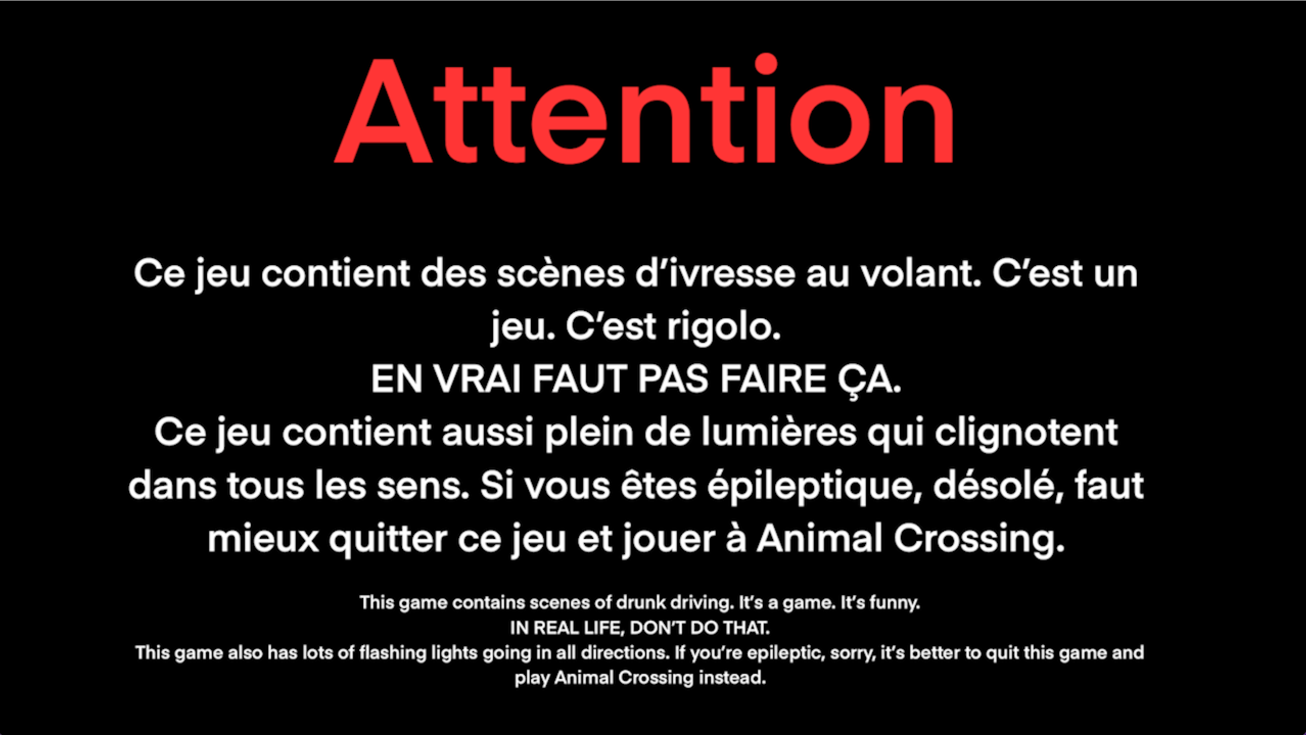 Translation : This game contains scenes of drunk driving. It's a game. It's funny. DON'T ACTUALLY DO THAT. This game also has lots of flashing lights going in a bunch of directions. If you're epileptic, we apologize, you're better off quitting the game to play Animal Crossing instead.